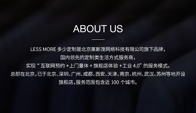 LESS MORE多少定制 2015年5月創(chuàng)立于北京,以互聯(lián)網(wǎng)思維和工業(yè)4.0切入服裝定制領(lǐng)域,獨創(chuàng)“互聯(lián)網(wǎng)預約+旗艦店體驗+免費上門量體+工業(yè)4.0 C2M生產(chǎn)”的模式,現(xiàn)已成為國內(nèi)服裝定制行業(yè)的標桿品牌。